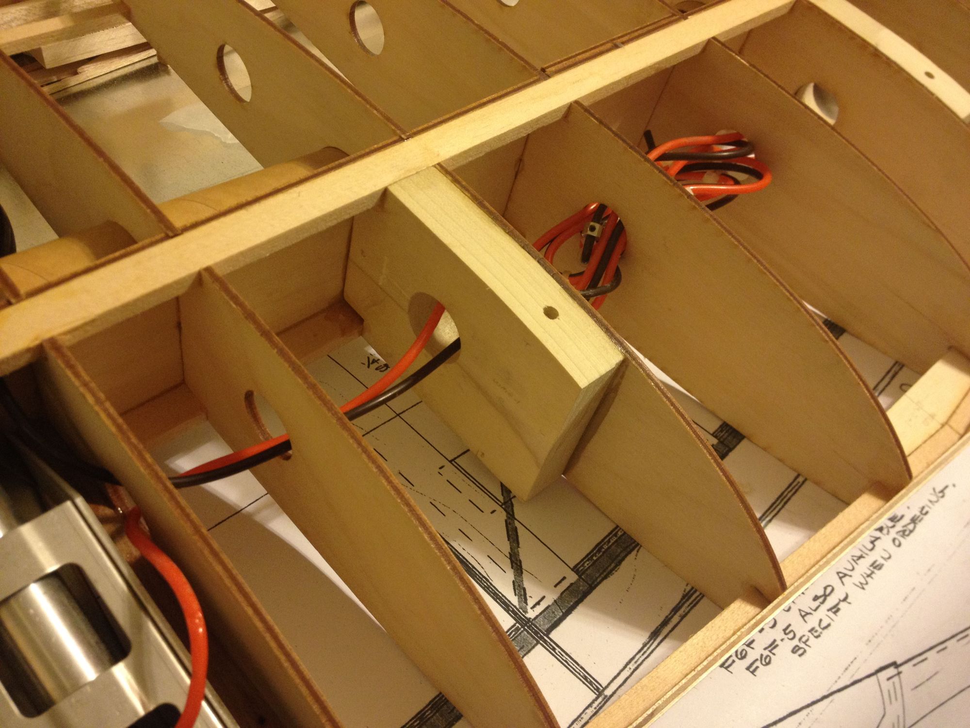 Top view showing the left wing front mount block - notches to fit between wing spars, cable/hose through hole and bolt hole. Bolt hole is counter bored from bottom.